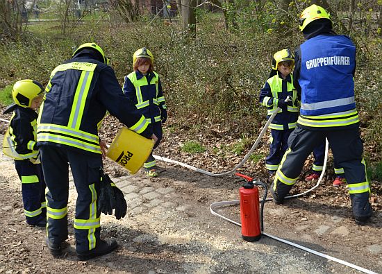 Der erste Alarm wurde um 11.12 Uhr an einer nachgestellten Unfallstelle ausgelöst. Ein Pkw war gegen eine Hauswand gefahren und es wareine technische Hilfeleistung nötig, da sich eine Person noch im Fahrzeug befand; zudem mussten wir auslaufende Flüssigkeiten auffangen und binden. An erster Stelle stand für uns die Sicherung des Pkw und der Unfallstelle. Die Kinder waren mächtig aufgeregt, zeigten aber auch erste Erfolge ihrer theoretischen Ausbildung in der praktischen Umsetzung. So konnten wir die Person gemeinsam retten und an das Team „Rettungsdienst“übergeben, damit anschließend das Team „Feuerwehr“ das notwendige Batteriemanagement durchführen konnte.