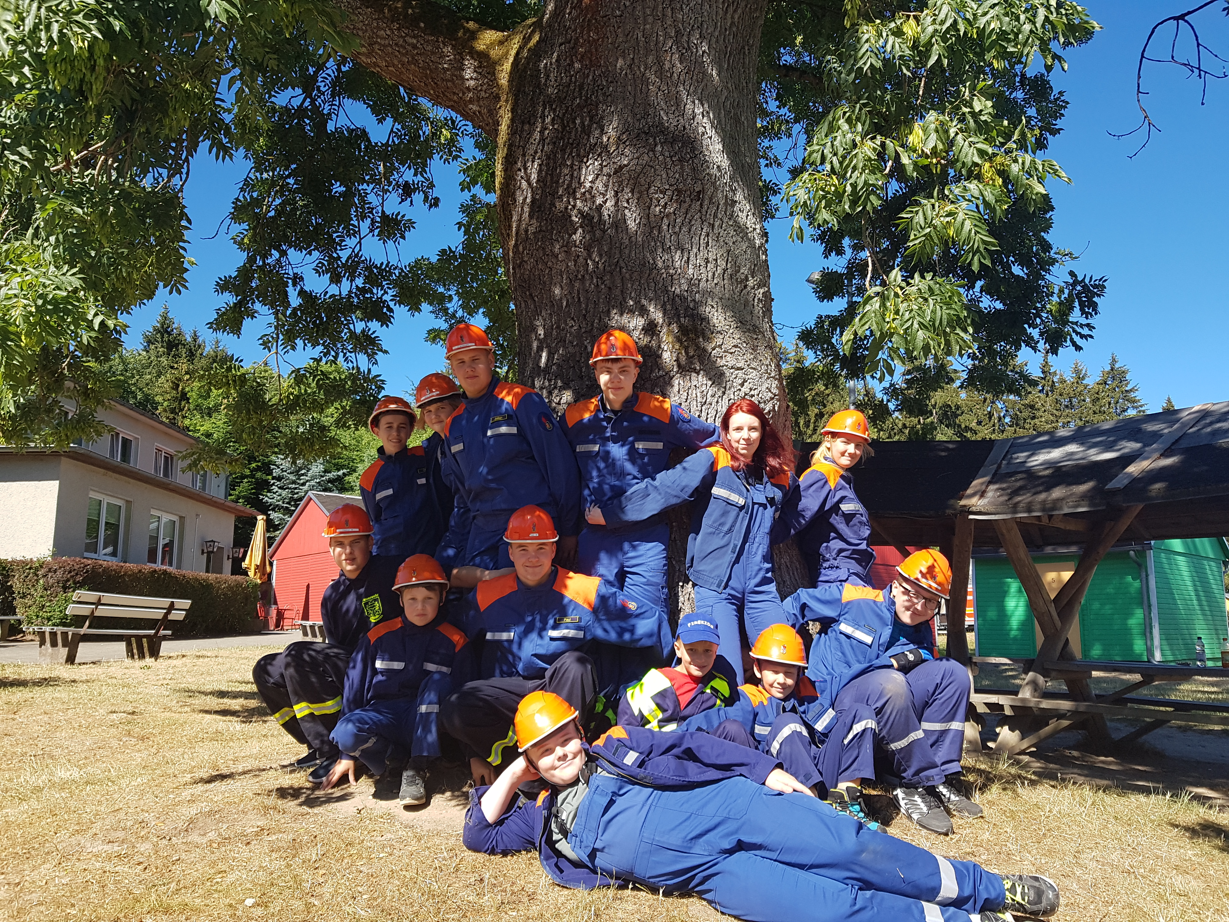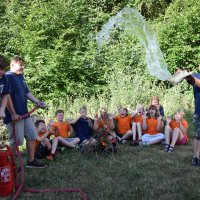 Nach dem Frühstück gab es für jede Gruppe noch eine letzte Einweisung, ehe sich 14 Mannschaften aus Jugend- und Kinderfeuerwehren auf den Weg machten, den Stationswettbewerb zu absolvieren. Parallel dazu wurde ein Fotowettbewerb durchgeführt, dessen Themen im Vorfeld bekannt gegeben wurden. Nicht nur dem Nachwuchs, auch den Betreuern war der Eifer anzusehen, der zu den Themen „Naturschutz“, „Einer für alle, alle für einen“ und „Feuerwehr ist mehr, als nur löschen“ entwickelt wurde. Zahlreiche aufregende Kunstwerke entstanden. Im Stationswettbewerb waren auch der Besuch im ehemaligen Bergwerk „Grube Glasebach“ und auf dem Josephskreuz enthalten. Für viele Kinder und Jugendliche das erste Mal unter Tage, oder auf dem Josephskreuz. Insgesamt mussten 9 verschiedene Aufgaben zum Thema Natur, Geschicklichkeit, Allgemeinwissen, sowie Spiel und Spaß absolviert werden. Alle Teilnehmer hatten sichtlich Spaß an der Natur, sowie an den einzelnen Stationen und wetteiferten um den Sieg. Im Tagesverlauf besuchte uns der Abschnittsleiter Ost des Landkreises, Hr. Sebastian Petrusch und konnte sich ein eigenes Bild von unserem Nachwuchs machen. Er war sichtlich beeindruckt von den ca. 250 Teilnehmern, die unser Verband auf die Beine gestellt hat. Der Abschnittsleiter des Bereiches West hatte aus persönlichen Gründen abgesagt, der Kreisbrandmeister folgte unserer Einladung leider nicht. Gegen Nachmittag trudelten alle Truppen wieder auf dem Gelände ein und es war noch ein bisschen Zeit bis zum Abendessen. Wie konnte man die Zeit bei diesen Temperaturen effektiv nutzen? Natürlich mit einem beherzten Sprung ins kühle Nass! Zum Abendessen heizten die Mitarbeiter des Feriendorfes einen großen Grill für uns an und jeder schnappte sich eine knackige Bratwurst. Doch ein Programmpunkt stand noch auf unserer Agenda. Eine Talentshow. Fast alle Mannschaften nahmen an dieser Teil und so gab es noch etwas Entertainment zum Abend. Von musikalischen Gesangseinlagen, über trommeln, bis hin zum Schauspiel „Rotkäppchen im Jahr 2018“, einer Feuerwehrtaufe, einer lustigen Aufführung zum Thema Feuerwehrlehrgänge, einem Kindertanz mit eigenen Instrumenten oder der Umrandung zu Hits wie „Ich will Spaß, ich geb‘ Gas“ wurde vieles für die Zuschauer geboten. Es wurde zahlreich gelacht und applaudiert! Doch auch der Samstag ging zu Ende.